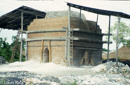 These kilns were on the road between Saraburi and Korat in 1989. The process is that you take limestone CaCO3 and heat it to about 843 ˚C (1550˚F) and it becomes quicklime. The quicklime is slaked in water becomine slaked lime, calcium hydroxide which is cementatious. The slaked lime is usually mixed with sand to become stucco or mortar. Fresco is typically done on a slaked lime. Prior to the development of Portland Cement in 1824 it was the main cementatious agent in building with bricks. It remained as the main cementatious agent in more remote states in the US into the 20th Century. It is still used in many applications. Like Portland cement it can be more efficiently made in rotary kilns and other contiuous manufacturing techniques where waste heat is reused.