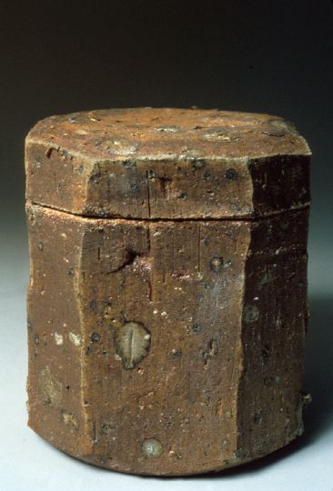 Octagon Blip Canister, ~1980. Wood fired stoneware with Gertsley Borate inclusions.