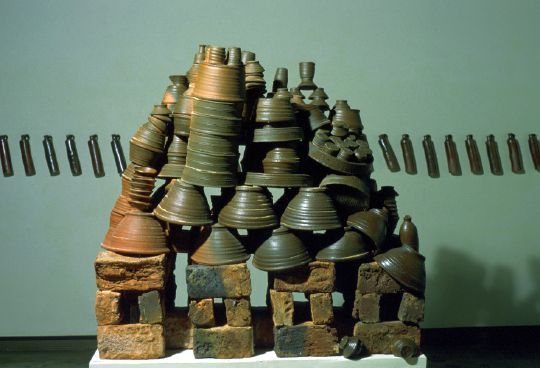 This piece was restacked in the gallery with the same placement it had in the kiln. The right side of the stack collapsed during the firing.