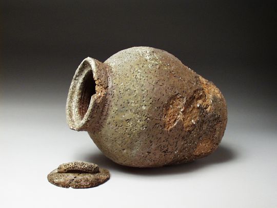 Marinated Jar, soda fired stoneware with woodash, bleached shipworm eaten wooden lid, linseed oil stain